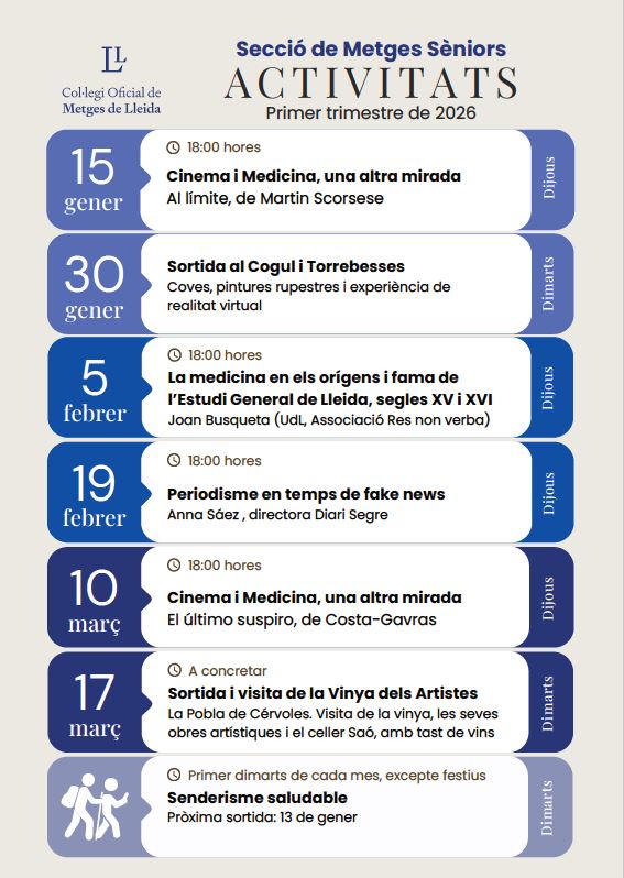 La Secció de Metges Sèniors ha organitzat tota una sèrie d'activitats per al primer trimestre de 2026, que trobareu en el document adjunt.
