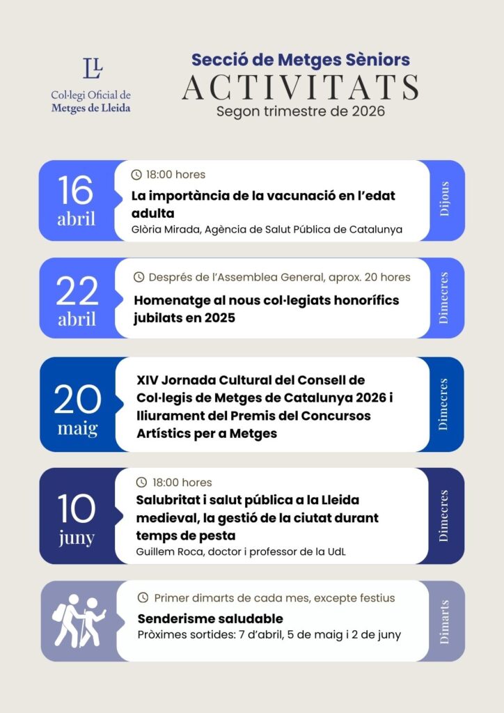 La Secció de Metges Sèniors ha organitzat tota una sèrie d'activitats per al primer trimestre de 2026, que trobareu en el document adjunt.