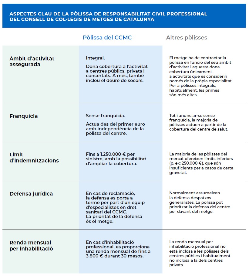 Un dels principals objectius del Consell de Col·legis de Metges de Catalunya (CCMC) és vetllar per la seguretat dels professionals i, en aquest sentit, és important que aquests comprovin que la seva assegurança de responsabilitat civil tingui unes cobertures adaptades als riscos reals de la pràctica mèdica. Exercir la medicina implica una responsabilitat elevada, ja que una reclamació o un incident poden afectar no només el futur professional dels col·legiats, sinó també el seu patrimoni. Per això, és important que l’assegurança d’RC estigui adaptada als riscos del professional i que el cobreixi directament, és a dir, que no estigui limitada a la cobertura indirecta del centre de treball. Tenir una pòlissa pròpia és la millor garantia de protecció.